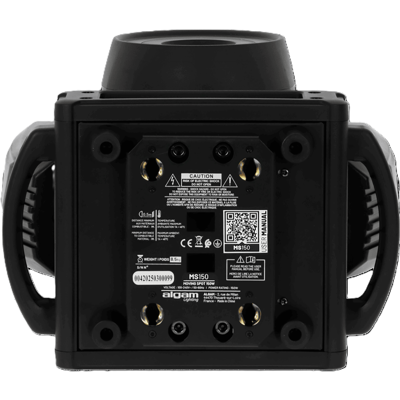 De MS150 moving head van Algam Lighting is een krachtige en veelzijdige spotprojector, perfect voor al uw evenementen. Met een 120 W witte LED en een 18 RGB LED-ring genereert hij een krachtige en nauwkeurige lichtbundel met een hoek van 15°, ideaal voor concerten, shows en architecturale accentverlichting. De RGB-ring voegt een creatieve dimensie toe met lichtgevende animaties en kleurrijke halo's. De MS150 biedt professionele functionaliteiten voor aangepaste lichteffecten. Hij is voorzien van een 7-kleuren + wit wiel, een 8-vast gobo-wiel en een 6-roterend gobo-wiel. Een 3-facet roterend prisma vermenigvuldigt de lichtbundels. De gemotoriseerde elektronische focus zorgt voor een perfecte projectiescherpte, terwijl 540° pan en 270° tilt een soepele en snelle ruimtelijke scanning garanderen. De MS150 is eenvoudig te gebruiken en biedt verschillende bedieningsmodi: DMX512 (16 of 17 kanalen), master/slave, geluidsgestuurd en automatisch. Hij kan worden bediend via een DMX-console of het geïntegreerde paneel en is RDM-compatibel voor beheer op afstand. Voor connectiviteit beschikt hij over Powercon True1-invoer/uitvoer en DMX-invoer/uitvoer. Hij wordt geleverd met een DMX-kabel, stroomkabel en twee OMEGA-beugels, zodat hij klaar is voor een veilige installatie.