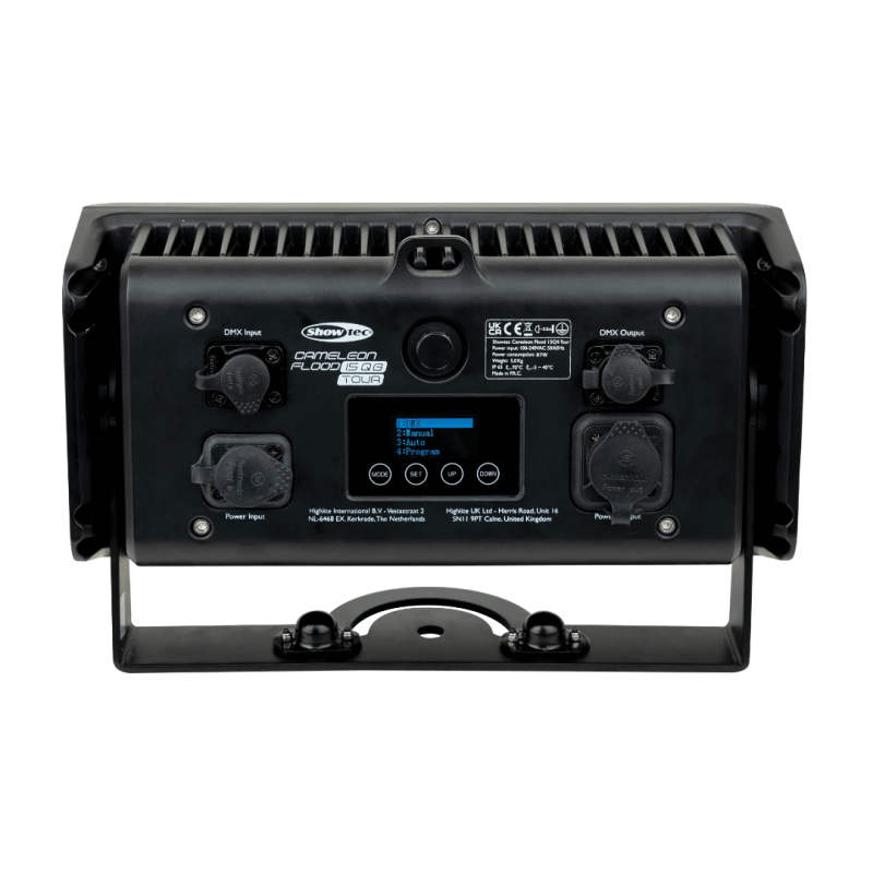 The Showtec Cameleon Flood 15 Q6 Tour is a 15x 10 watt RGBWA-UV LED Flood with IP65 rating, suitable for indoor and temporary outdoor applications. It has a 40° fixed beam angle and features 0 - 100 % dimmer and 0-20 Hz strobe effects, perfectly suitable for colour mixing on stage. The Cameleon Flood 15 Q6 Tour can be controlled manually, via DMX, Master/Slave, and IR remote in either Manual or Auto-run mode with many available built-in programs. It is equipped with Seetronic Power Pro True IP65-rated power connectors, which are compatible with the leading brands. A bracket for easy fixation is included. An infrared remote is optionally available.