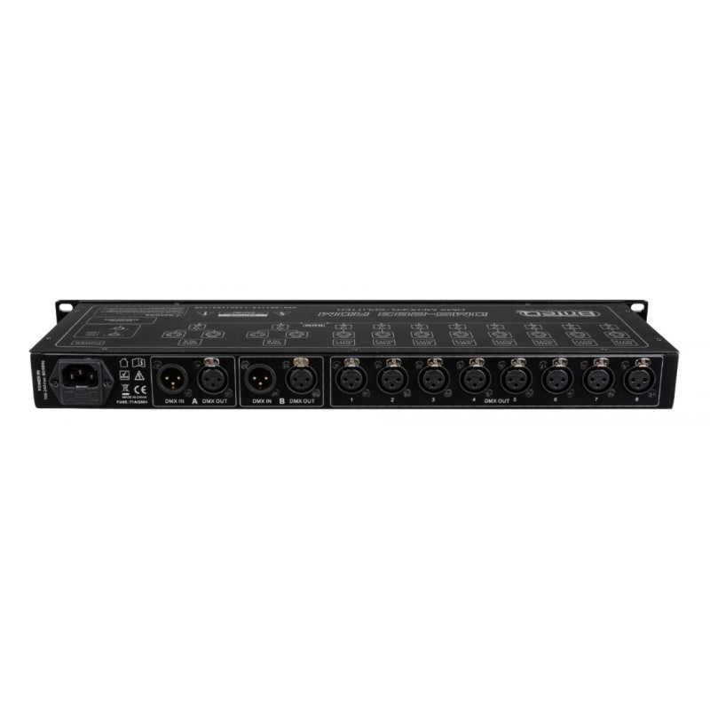 DMX-merger + splitter + booster met RDM-ondersteuning, beveiligt je DMX-installatie door 100% elektrische isolatie tussen 2 ingangen en 8 uitgangen. Uitgerust met XLR-3pin.