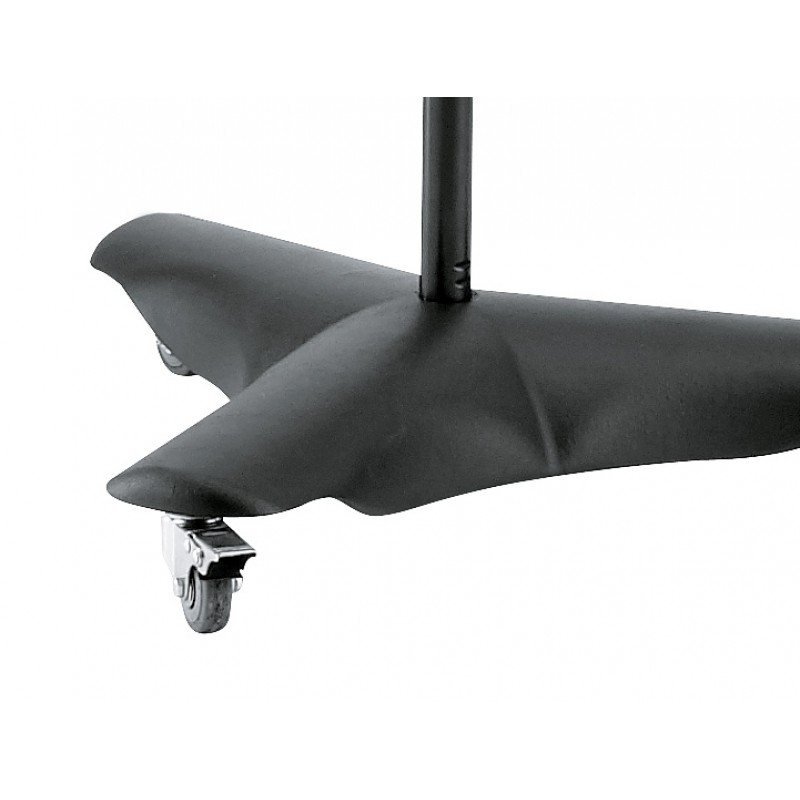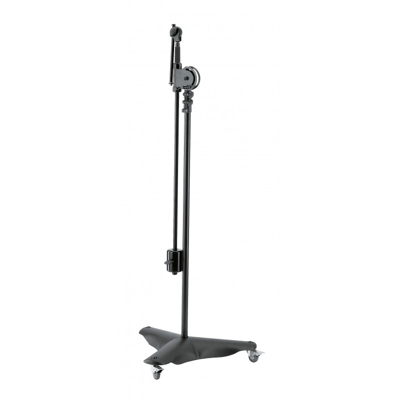 Mobile heavy steel microphone stand for studio or stage. 10 kg cast metal base, low centre of gravity for high level safety with 3 lockable castor wheels. Rod combination extends to over 2 m with additional locking mechanism. Extendable boom arm with a 3 kg counterweight and 5/8" connecting thread. Additional mini boom arm with 5/8"- and 3/8"- connecting thread, fully adjustable regardless of the position of the main boom arm, e.g. to use with studio microphones.