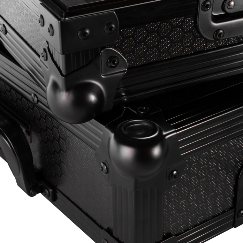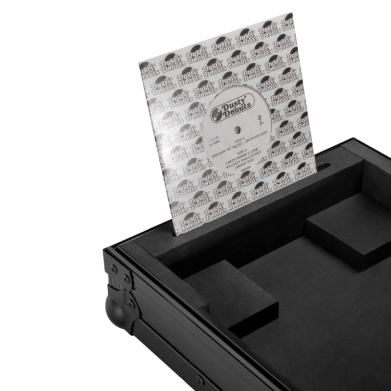 De koffer is ontworpen voor gebruik in de praktijk en heeft een afneembaar deksel voor een snelle installatie, een geïntegreerde 7″-hoeshouder voor snelle toegang tot platen en een afstandring met puckhouder om de draaitafel op zijn plaats te houden en tegelijkertijd de spil te beschermen. Of u de koffer nu direct gebruikt of met het deksel stapelt voor een verhoogde opstelling, deze koffer biedt flexibiliteit zonder compromissen. Kabels kunnen netjes worden opgeborgen in het onderste gedeelte van de koffer, waar de gewatteerde bodem speciale ruimte biedt voor accessoires.