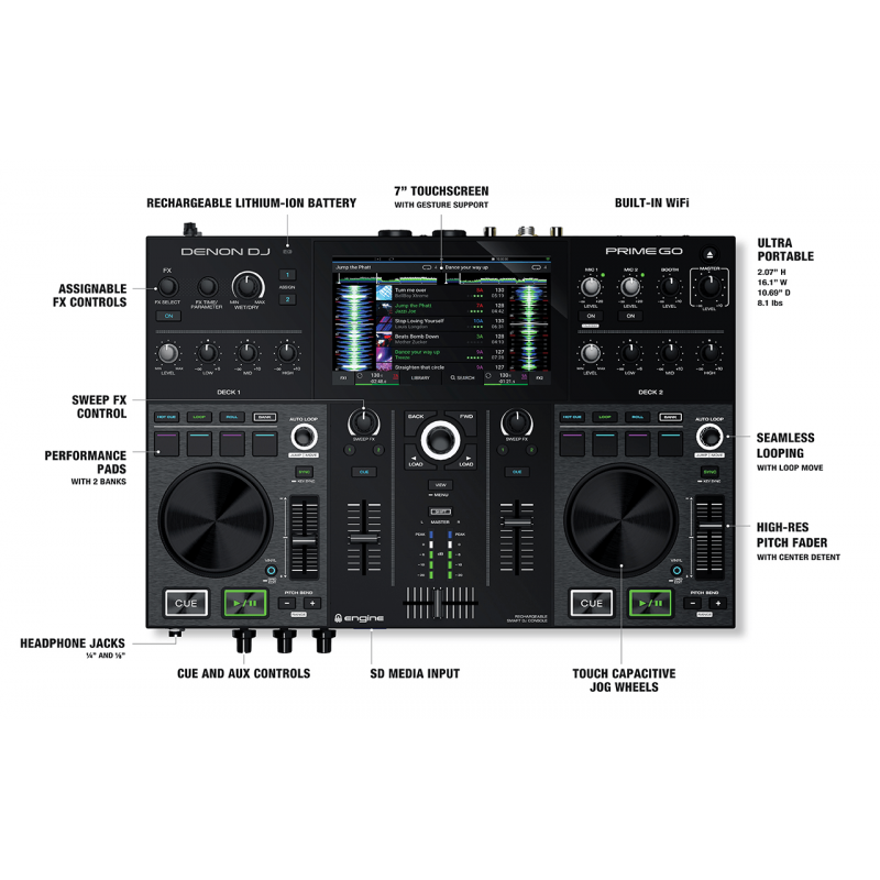 PRIME GO's, 7" HD Touchscreen geeft een DJ tactiele controle over zijn of haar bibliotheek navigatie, de waveform weergaven plus het zoeken en laden van tracks. Bovendien maakt het touchscreen de bekende 'touch / swipe' controle mogelijk. Een andere troef van de Prime GO is de mogelijkheid om rechtstreeks muziek te selecteren en af te spelen van één van de ondersteunende muziekdiensten (Tidal, Soundcloud, Deezer, … ) door middel van WiFi streaming. De Prime GO komt voorzien van de functie om rechtstreeks je dj set op te nemen op SD of USB media.
