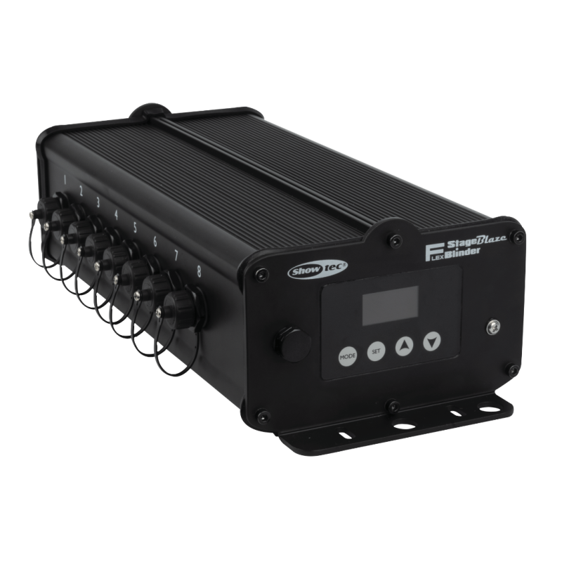 De Showtec Stage Blinder FLEX Blaze is een set van 8 high-power LED publieksblinders van 100 W elk en een speciale controller. Elke individuele pod heeft een krachtige warm witte COB LED van 3000 K met geïntegreerde amber LED's om de tungsten dimming van traditionele blinders perfect na te bootsen. Met de geïntegreerde RGB LED-lichtbronnen kun je unieke full-colour blaze-effecten creëren. De krachtige LED-lichtbron gecombineerd met een stroboscoopfunctionaliteit maakt het mogelijk om de Stage Blinder FLEX Blaze te gebruiken als stroboscooplamp met unieke kleureffecten. Het lichteffect kan worden aangestuurd via DMX/RDM, Master/Slave, maar kan ook in stand-alone modus werken met verschillende ingebouwde programma's.