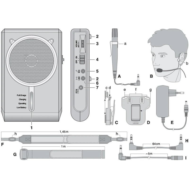 Draagbare, krachtige digitale stemversterker van 7 W die een hoogwaardig geluid levert voor stemtransmissies en een zeer hoge stabiliteit in verhouding tot zijn ultracompacte formaat. Het is geschikt voor algemene mobiele spraaktoepassingen vanwege de veelzijdige draagmogelijkheden, bijvoorbeeld lezingen en trainingen, verkoopevenementen. Met de nieuwste technologie van ingebouwde lithium-accu's, digitale versterking en een perfecte afwerking van hoge kwaliteit is hij dankzij de extra lijningang zelfs geschikt als miniatuuroplossing voor externe audiobronnen (MP3-spelers en laptops). De versterker wordt geleverd met een electret-hoofdbandmicrofoon HSE-700, een mini electret-microfoon ECM-700, een digitale actieve luidspreker, een microfoonverlengkabel, een lijnaansluitkabel, een plug-in oplader, twee clips, een heupriem, een draagriem riem en één transporttas.